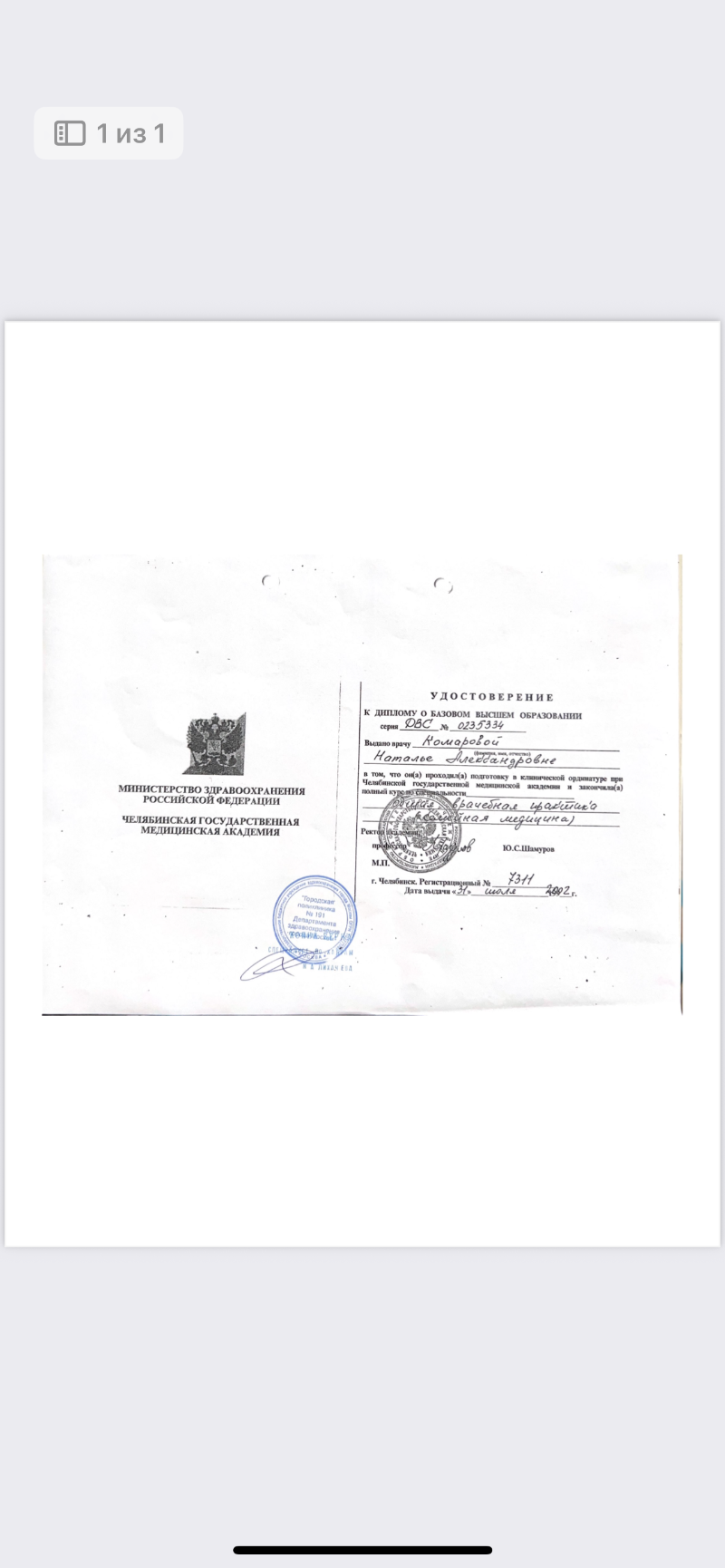 Место работы: ГБУЗ Городская поликлиника 191